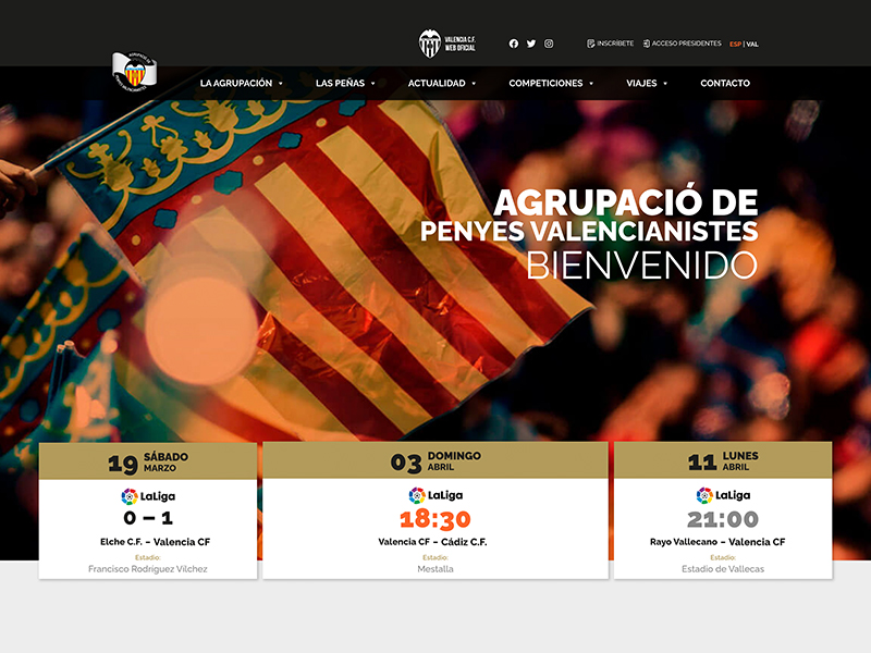 La Agrupación de Peñas Valencianistas reúne a las peñas oficiales del Valencia CF, un colectivo que representa la esencia y la pasión de la afición valencianista. Para esta entidad, realizamos el restyling completo de su sitio web, modernizando su estética y organización visual sin modificar los contenidos originales. El objetivo fue actualizar su presencia digital, aportar claridad y reforzar la identidad de un movimiento social tan arraigado en la cultura futbolística valenciana.