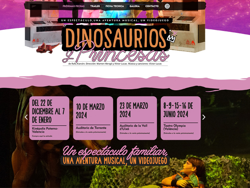 «Dinosaurios y Princesas» es un espectáculo familiar que combina música, narrativa y elementos visuales llamativos para crear una experiencia inmersiva para niños y familias. Socarrat Studio diseñó su sitio web, adaptando la estética al universo del espectáculo: colorido, dinámico y lleno de fantasía. El resultado fue una plataforma que refleja el espíritu lúdico y mágico de la obra.